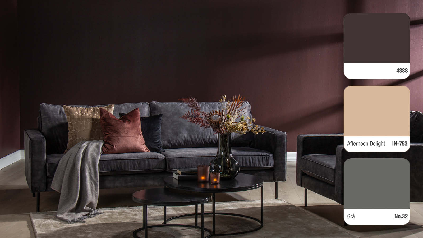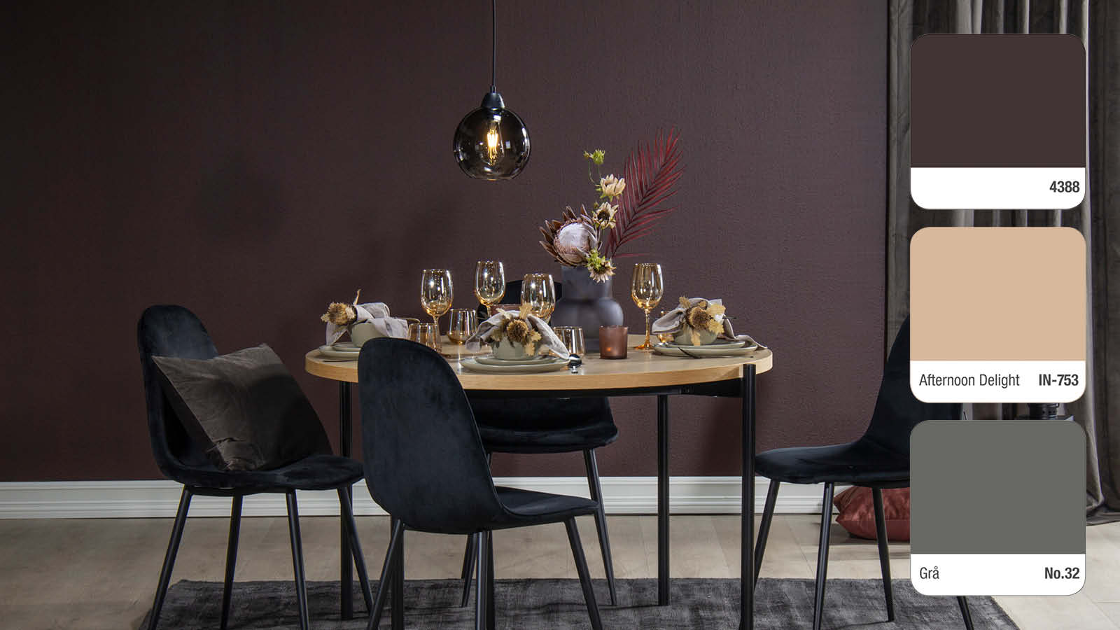 Denne første paletten tar utgangspunkt i den nydelige burgunderfargen 4388. Denne nyansen har Mina kombinert med IN-753 Afternoon Delight, No.32 Grå og No.40 Mushroom Grey. “Paletten har et elegant uttrykk, og er en behagelig kombinasjon av flotte høstfarger i dype toner som enkelt kan kombineres med taupé og gråtoner”, sier hun.