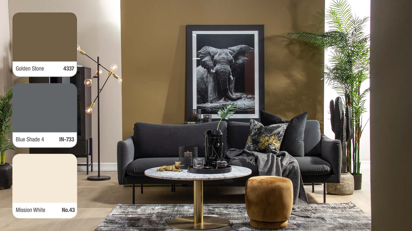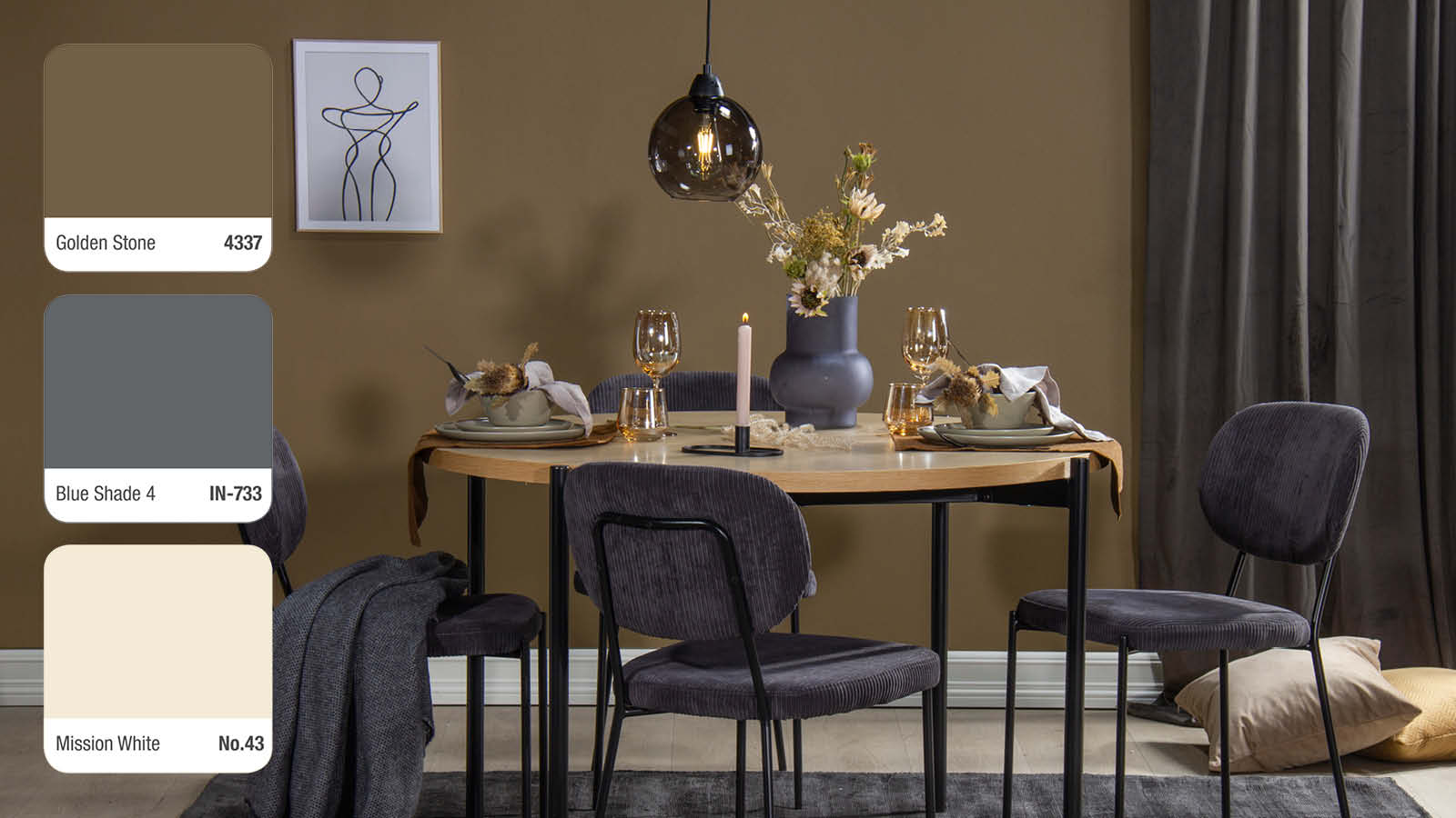 Den andre paletten er en moderne vri på varme toner, med 4337 Golden Stone som base og No.43 Mission White som aksentfarge. Det hele komplementeres med en blå brytning i IN-733 Blue Shade 4 som skaper et spennende spill i nyansene.