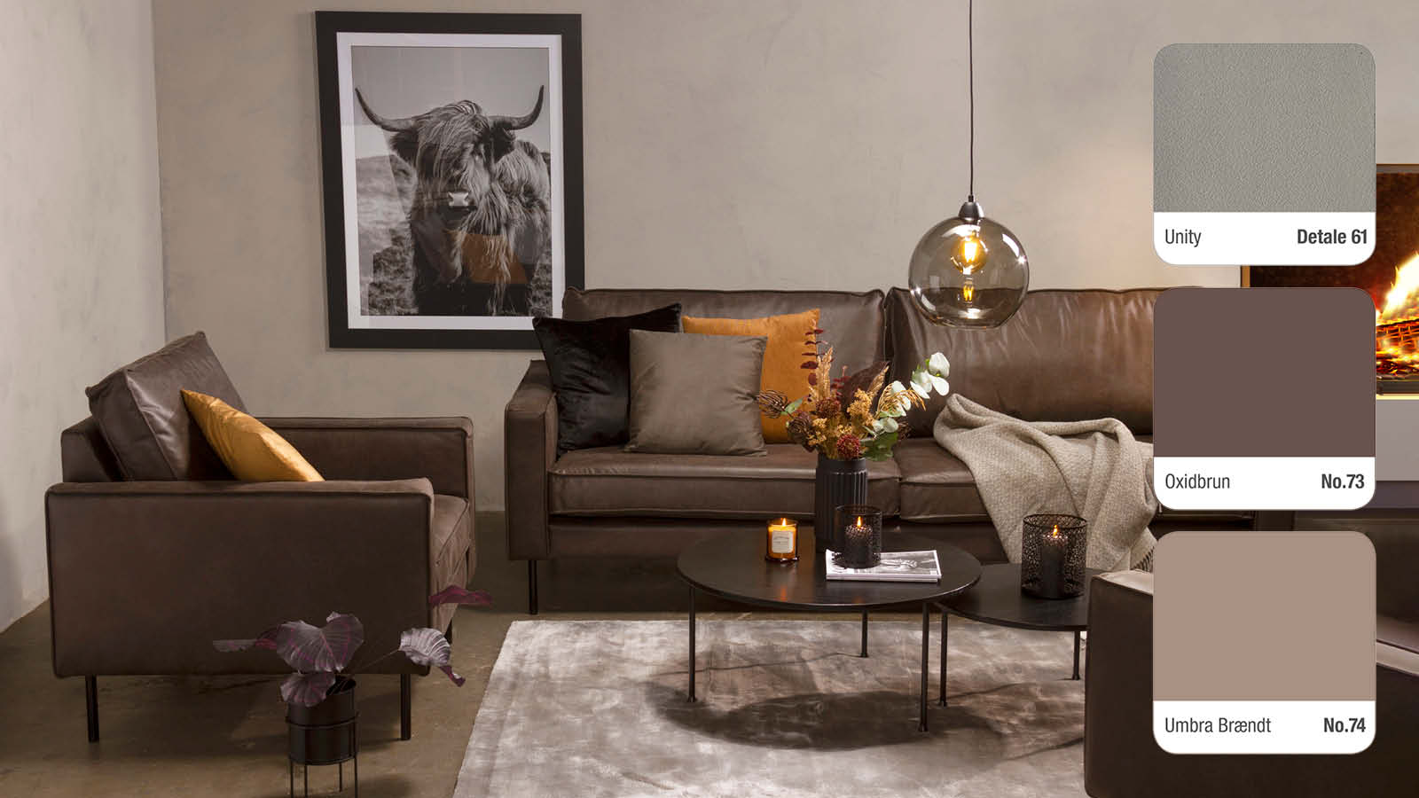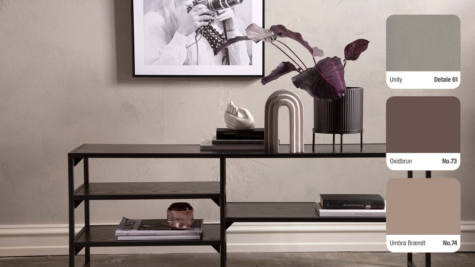Den neste paletten tar utgangspunkt i spesialmalingen KABRIC i fargen Unity. Det levende uttrykket på veggen komplementeres med jordtoner som No.73 Oxidbrun og No. 74 Umbra Brændt, som gir helhetsuttrykket en stilren og klassisk look samtidig som man får en luksuriøs følelse.