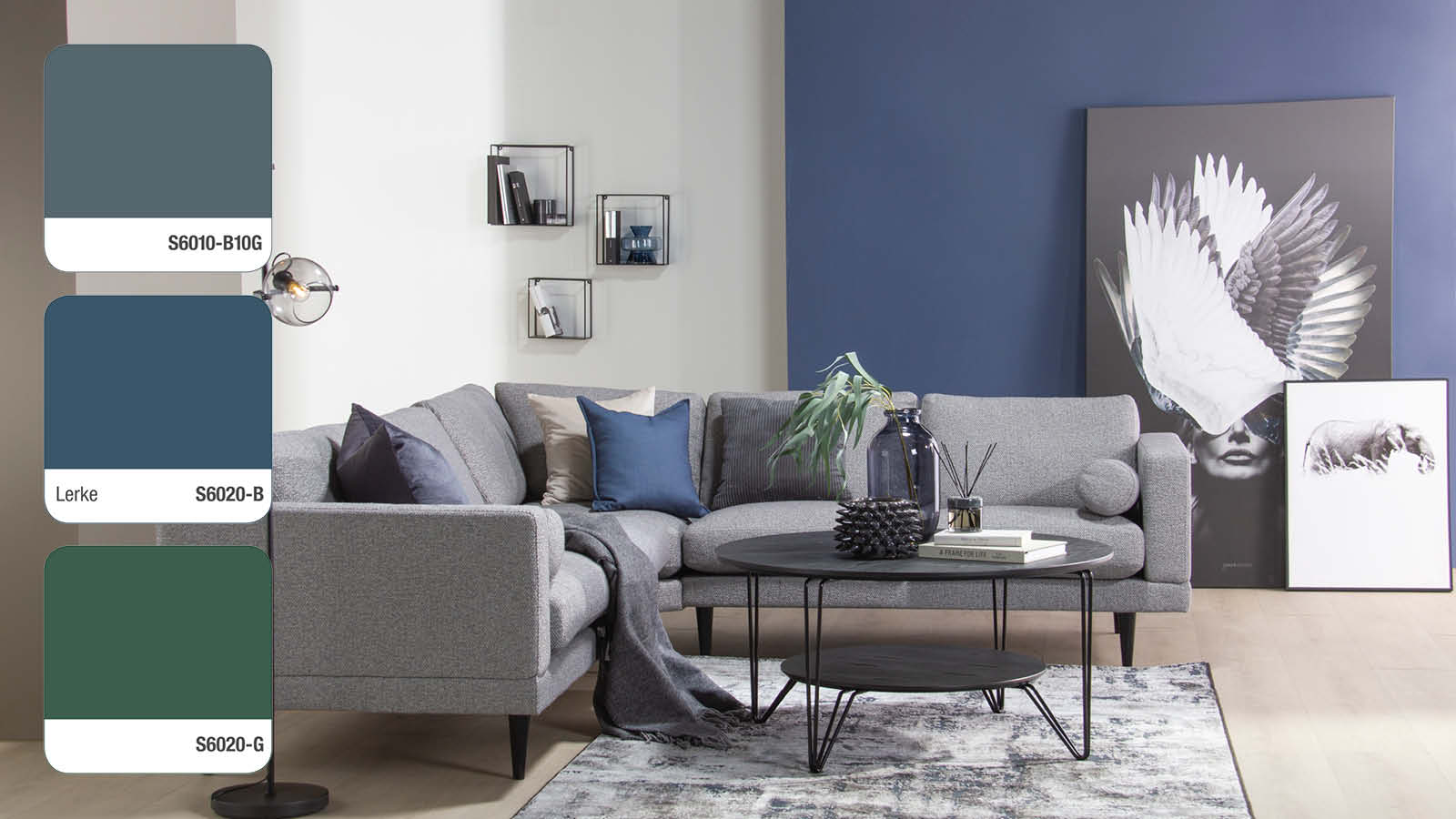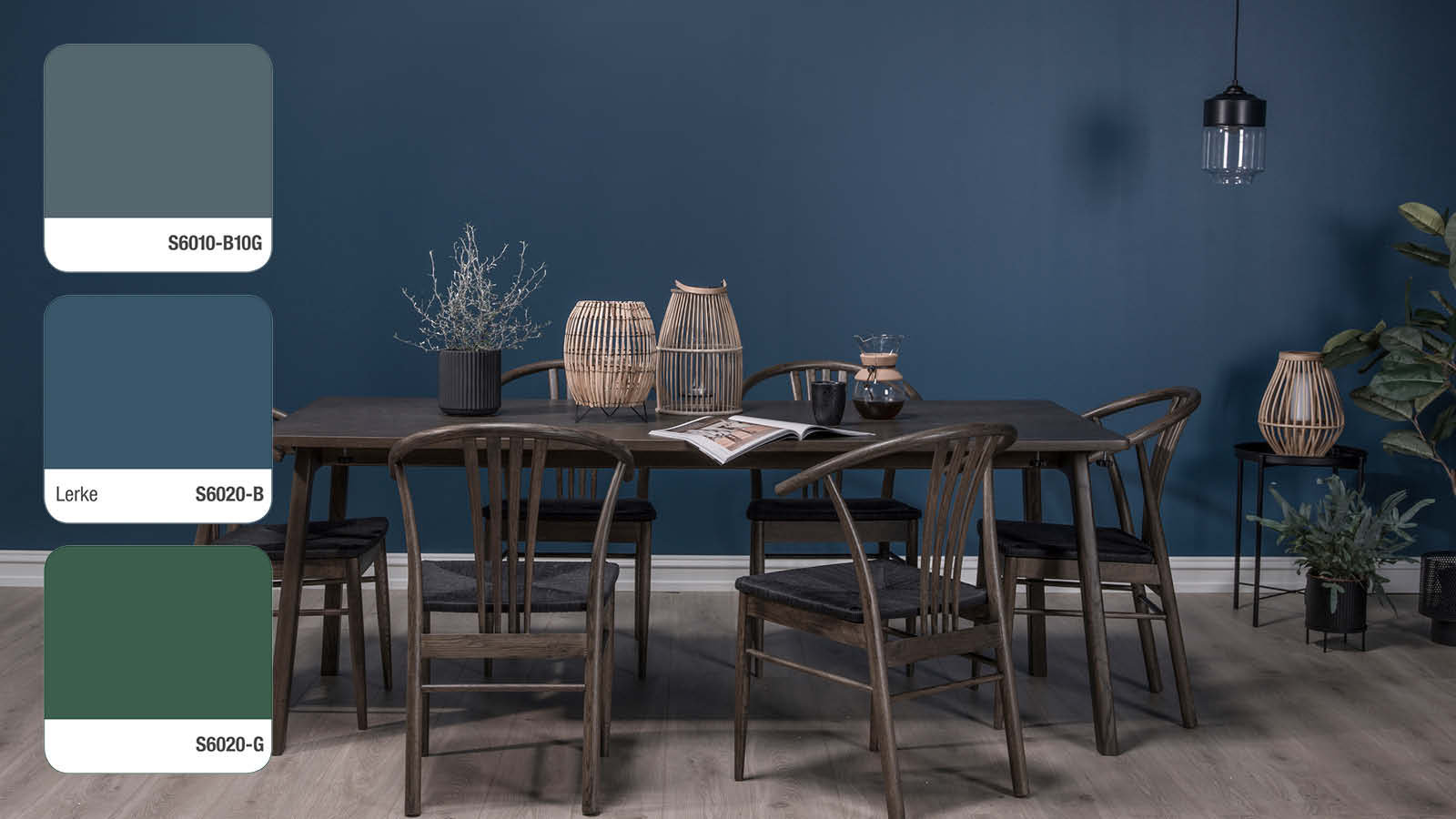 Den siste paletten bygges på fargen Lerke S6020-B som base. Fargekonsulent Mina kombinerer fargen med S6010-B10G og S8502-G, som begge er dype, kjølige farger. Disse passer godt til høst- og vinterstemningen. De har et lunt utseende med grå undertoner, som gjør at de harmonerer fint sammen. Hun sier de fint kan komplementeres med naturlige elementer i interiør og innredning.